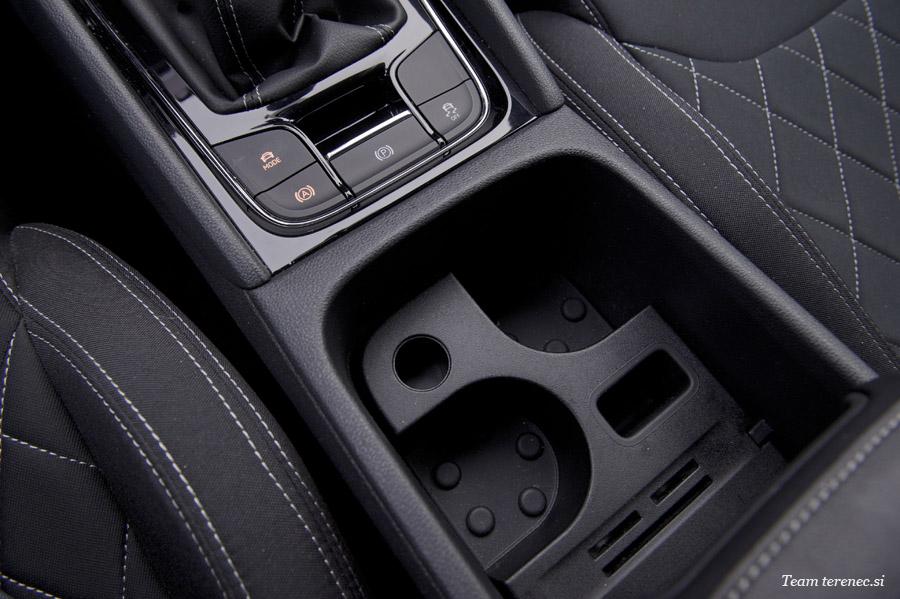 Sam sedalni položaj je dober in voznik si ga lahko nastavlja v vse smeri, kot tudi volan po globini in višini. Na sredinski konzoli med sedežema je nekaj odlagalnega prostora, ravno tako pod naslonom za roke. Ročna zavora je elektronska in poleg nje še gumb za nastavljanje voznih programov. Vratna »žepa« sta normalne velikosti in sprejmeta kakšno manjšo plastenko pijače. Na vrhu armature je še ena manjša zaprta odlagalna shramba. Potnika spredaj imata dovolj prostora. Potnika zadaj imata dovolj prostora za noge, a tretji na sredini bo precej trpel oz. v tem razredu za tretjega odraslega potnika žal ni pravega prostora.
