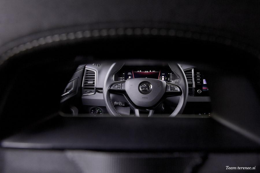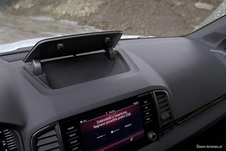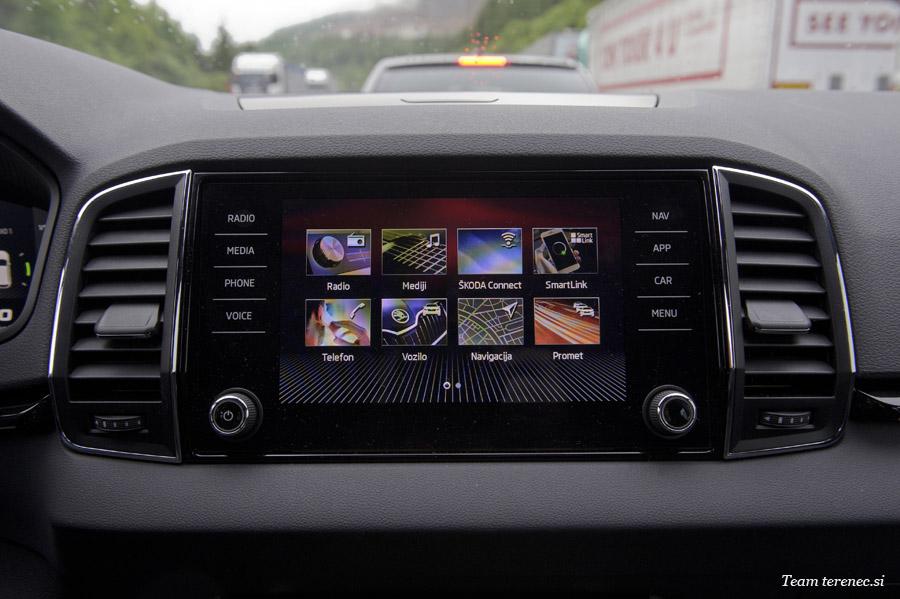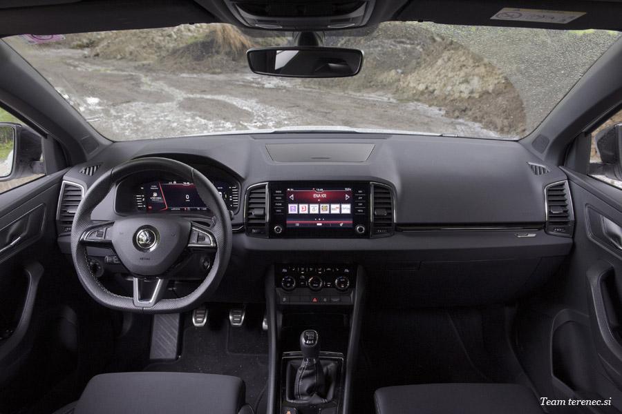 Notranjost je zaradi nivoja opreme Sportline izpopolnjena in dodelana z velikima, sodobnima zaslonoma. Seveda vsega se ne dobi v omenjeni opremi in je treba še kaj dodati, a kljub temu je Karoq precej opremljen. Opremljen je z 8-palčnim zaslonom na dotik, ki z doplačilom omogoča navigacijo. Standardno se lahko povežemo z Apple CarPlay in Android Auto. Zaslon je zelo jasen, enostaven, odziven in slika je kristalna. Klimatska naprava je ločena od zaslona in postavljena nekoliko nižje. Zagon motorja opravimo samo s pritiskom na gumb. Multi funkcijski volan je tri kraki in oblečen v usnje. Voznikovi inštrumenti so digitalni in opremljeni z vsemi potrebnimi podatki. Sam grafični prikaz si lahko prilagajamo po svojih željah.
