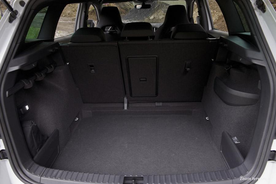 Prtljažnik je precej velik s pomanjkljivostjo, da nima dvojnega dna. Ko podremo zadnjo klop nastane večja stopnica. Klop je deljiva v razmerju 40:60 in v večjem predelu imamo še manjšo odprtino za prevoz daljših predmetov. Karoq ima 521 litrov prostora in se ga razširi na 1.630. Tiguan ima pri običajni postavitvi za 94 litrov več in ob podrtju klopi le 25 litrov več.