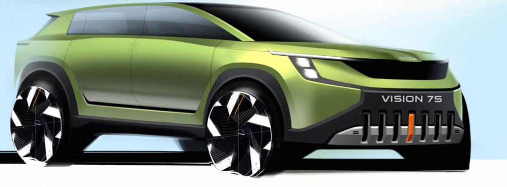 Skice zunanjosti izključno baterijsko električno gnane konceptne študije ŠKODA VISION 7S prikazujejo novo zasnovani, markantni sprednji del. Bistveno širša in nižja Škodina mreža hladilnika je zaprta in v temni izvedbi. Sprednji žarometi so pomaknjeni na skrajni rob vozila in so razporejeni v dveh vrstah drug nad drugim. Nad njimi leži ostro začrtan pas dnevnih luči, ki ob straneh sega na močno razširjene blatnike in svetlobno grafiko razširja v obliko črke T.