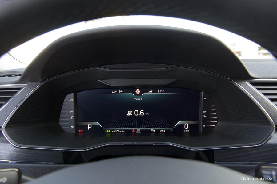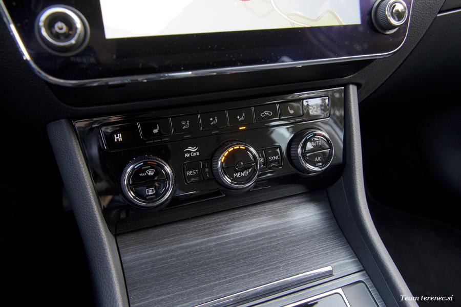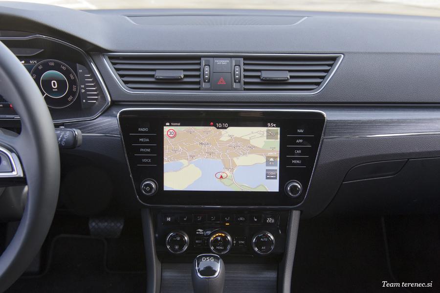 Velik digitalni informacijski zaslon pred voznikom prikaže vse pomembne informacije in voznik si sam prilagaja določene grafične prikaze zaslona. Volan lepo sede v roke, oblečen je v dobro usnje in opremljen z gumbi za hitrejše in varnejše upravljanje vozila ter različnih sistemov. Na osrednjem delu armature se bohoti velik 8-palčni multi funkcijski zaslon, ki nudi čisto grafiko in zelo kakovostno sliko. Na zaslonu imamo številne aplikacije in koristne podatke, ki pridejo prav med samo vožnjo. S sistemom SmartLink+ se lahko povežemo z vsemi pametnimi telefoni in tako lahko med vožnjo varno komuniciramo z zunanjim svetom. Sistem omogoča pošiljanje podatkov v vozilo in obratno. Ko se povežemo v splet, vidimo kje so najbližje bencinske črpalke, kakšno bo vreme na cilju, kje na poti nas čakajo zastoji in še veliko drugih uporabnih aplikacij. Klimatska naprava je tro-področna, kar pomeni, da si lahko potniki na zadnji klopi sami uravnavajo temperaturo ali jakost pihanja. V času tehnologij ima Superb Combi prijetno ambientalno osvetlitev. Odličen zvok prihaja iz zvočnega sistema Canton.