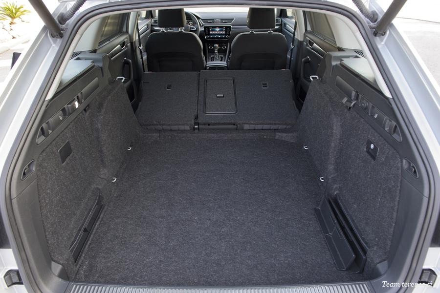 Prtljažnik je zelo prostoren in precej uporaben. Prtljažna vrata so velika, kar omogoča natovarjanje večjih škatel in celo pralnega stroja ali hladilnika. Uporabniku že pri vsakodnevni potrebni nudi 660 litrov prostora, ko pa podremo zadnjo klop v celoti, dobimo neverjetnih 1.950 litrov. Klop se podre v dveh delih z enostavnim potegom ročic v prtljažnem delu. V prtljažnik so dodali še 12V vtičnico in prvo pomoč v desno steno prtljažnika . Testni Superb Combi je imel žal samo enojno prtljažno dno, čemur pripisujemo velik minus, saj bi dvojno dno pričakovali že serijsko. Glede na izrazito velikost prtljažnika, bi pri opciji dvojnega prtljažnega dna lahko po podrtju zadnje klopi v vozilu z lahkoto prespali dve odrasli osebi.