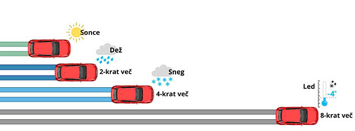 - Samo zimske pnevmatike na vseh kolesih omogočajo uspešno speljevanje in pospeševanje, učinkovito zaviranje, nespremenjeno smer pri zaviranju in varno vožnjo skozi ovinke.